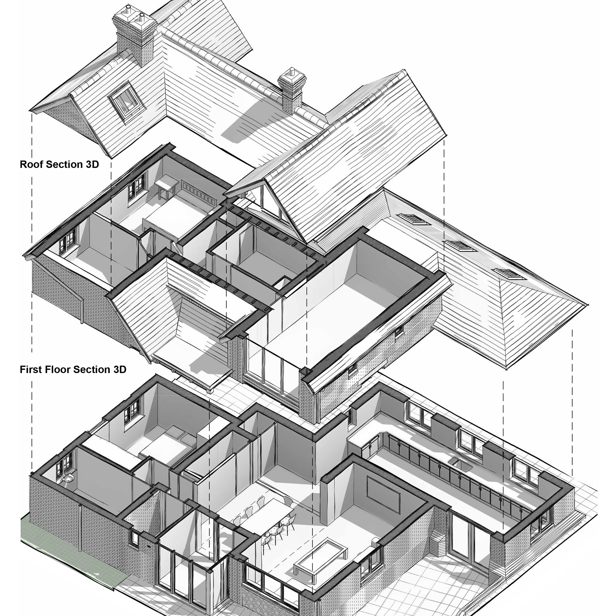 Mill Cottage is a captivating extension project is in an Area of Outstanding Natural Beauty. Redesigning a 1900s farmer’s cottage into a spacious four-bedroom family home, this space focuses on fabricating its ground floor plan and how the new spaces blend in with the house’s original masonry. Reminiscent of the old cottage, the design offers unique spaces with sloping ceilings that add character to the home’s interior and exterior. Our architects designed this proposal following planning advice and in-depth client meetings, using 3D software to help ensure every space was as the client envisaged.